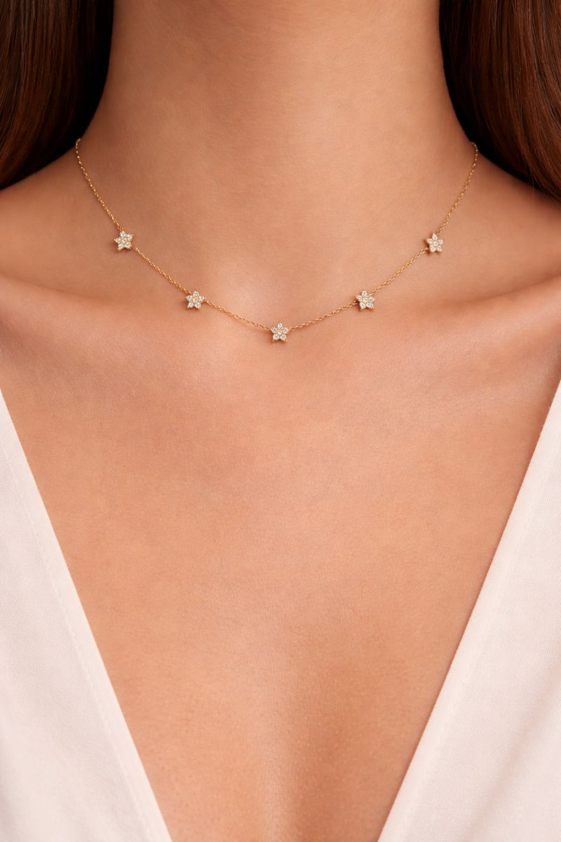 Elevate your everyday elegance with our Celeste Star Anti-Tarnish Neckchain. Designed with a fine gold-tone stainless steel chain, this piece features delicate sparkling star-shaped motifs placed gracefully around the neckline, giving a soft, feminine and luxurious look.