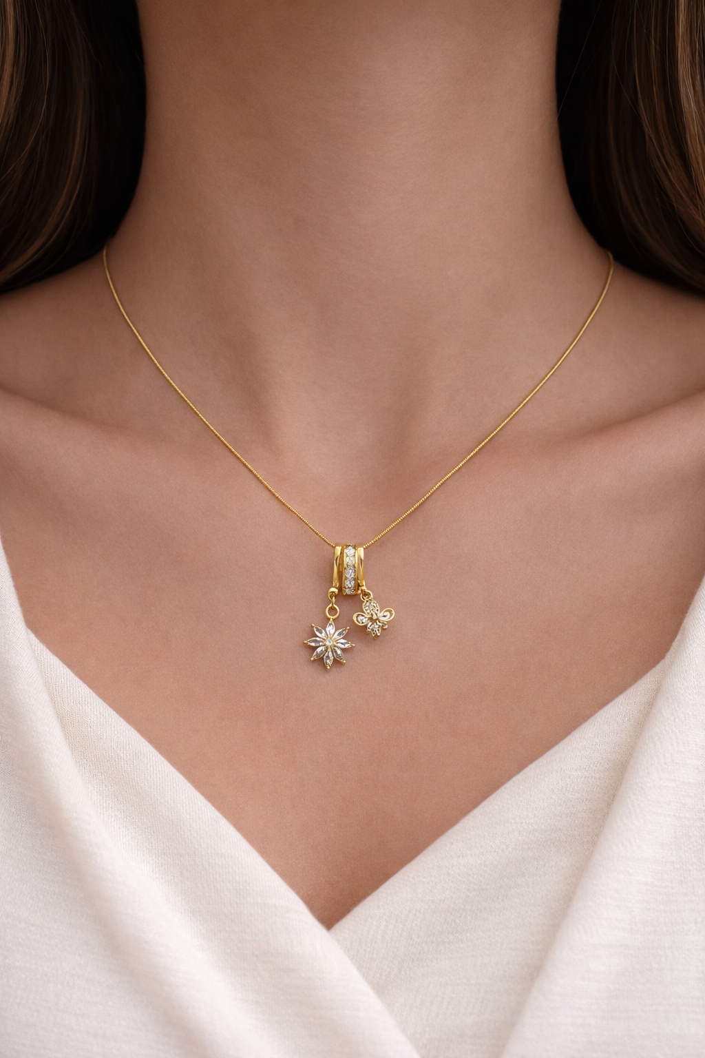 Grace your neckline with timeless sparkle in the Celestial Bloom Charm Neckchain. Crafted from premium anti-tarnish stainless steel, this elegant gold-tone chain features a delicate floral charm accented with shimmering stones, paired with a minimal dangling detail for added movement and charm.