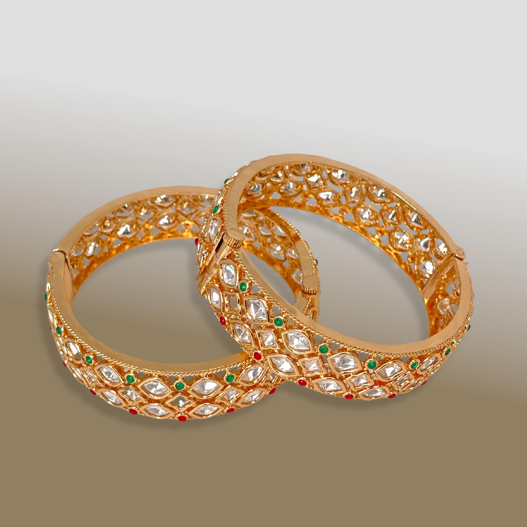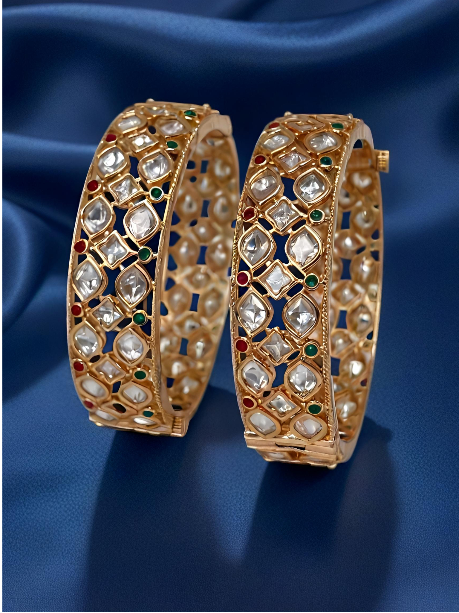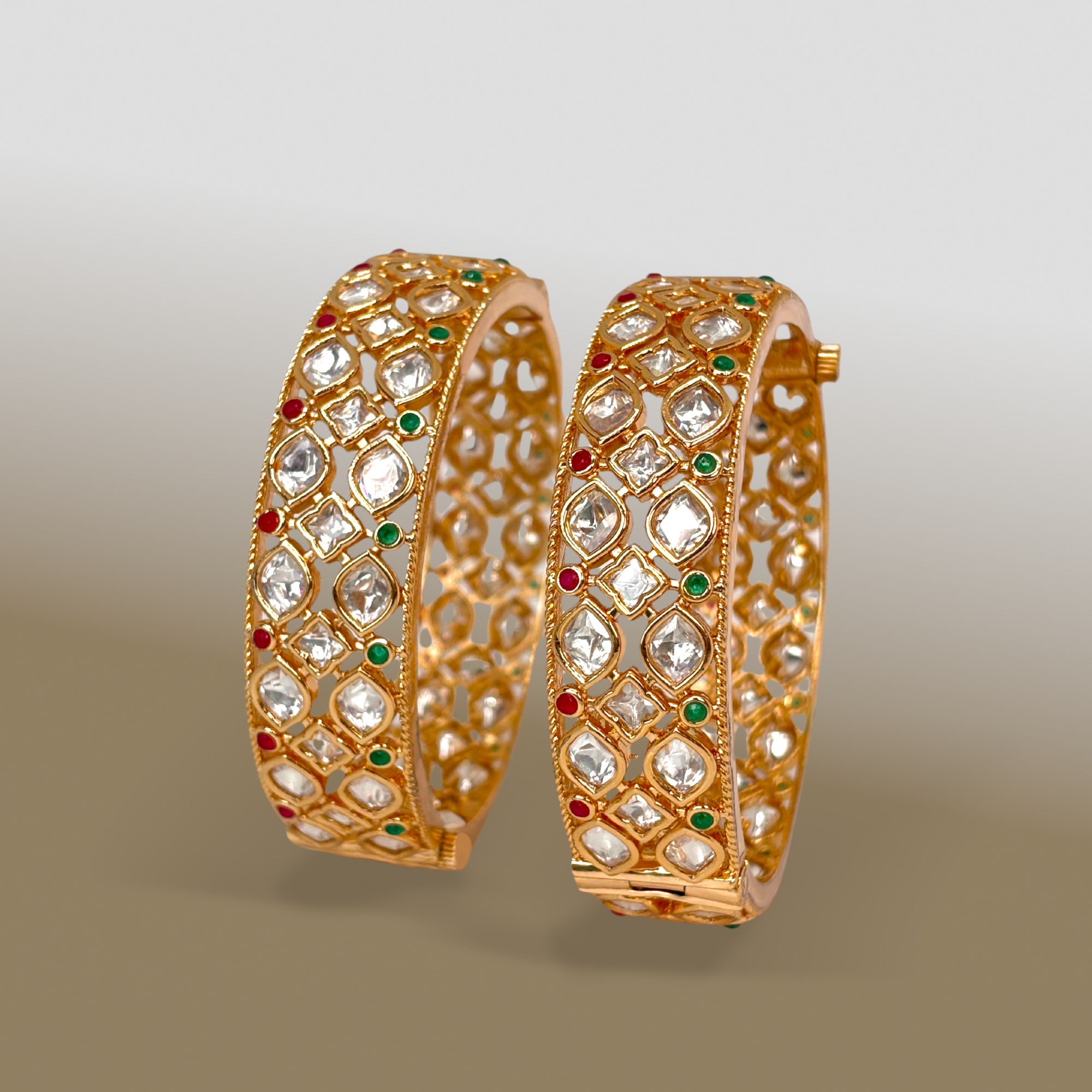 Embrace regal charm with our Chandra Kundan Polki Bangles, exquisitely handcrafted to elevate your festive and wedding looks. These stunning open-cut gold-toned bangles are adorned with traditional uncut Polki Kundan stones, accentuated with vibrant red and green enamel dots. The intricate lattice design allows for a lightweight yet luxurious finish, offering both comfort and elegance.