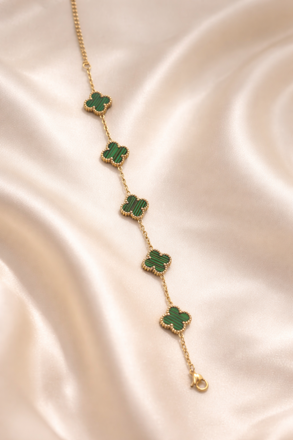 Sleek, timeless, and effortlessly elegant — our Elegant Green Clover Bracelet is designed for women who love minimal luxury. Featuring a series of glossy green clover motifs delicately linked on a fine gold-tone chain, this bracelet adds a bold yet graceful touch to any outfit.