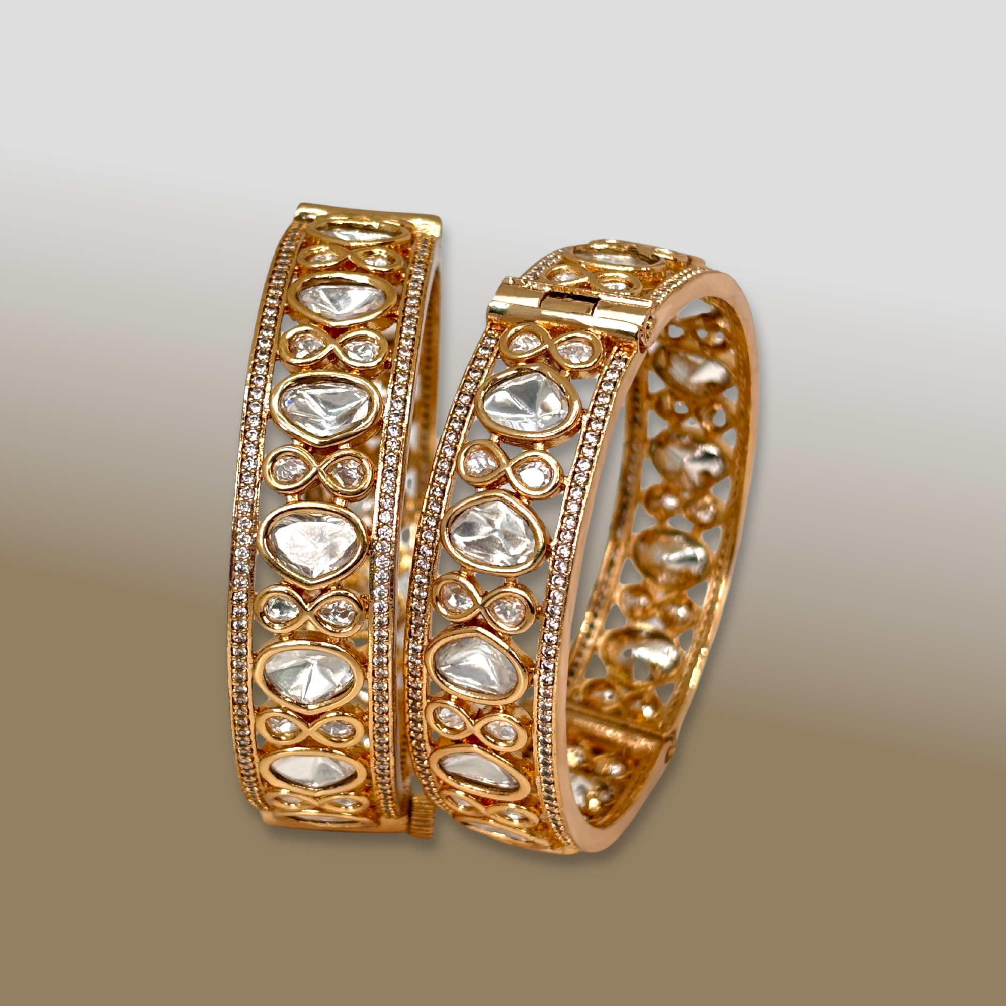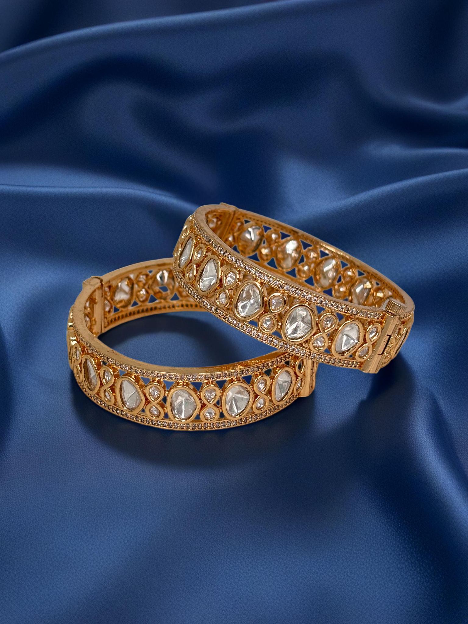 Elevate your ethnic charm with our Noor Kundan Polki Elegance Bangles, a flawless blend of traditional craftsmanship and modern finesse. These bangles are intricately designed with large teardrop and round Polki-style Kundan stones, bordered with delicate American Diamonds for that extra sparkle. The open-cut design and symmetrical detailing make them a perfect statement accessory for weddings, festive occasions, or cultural celebrations.
