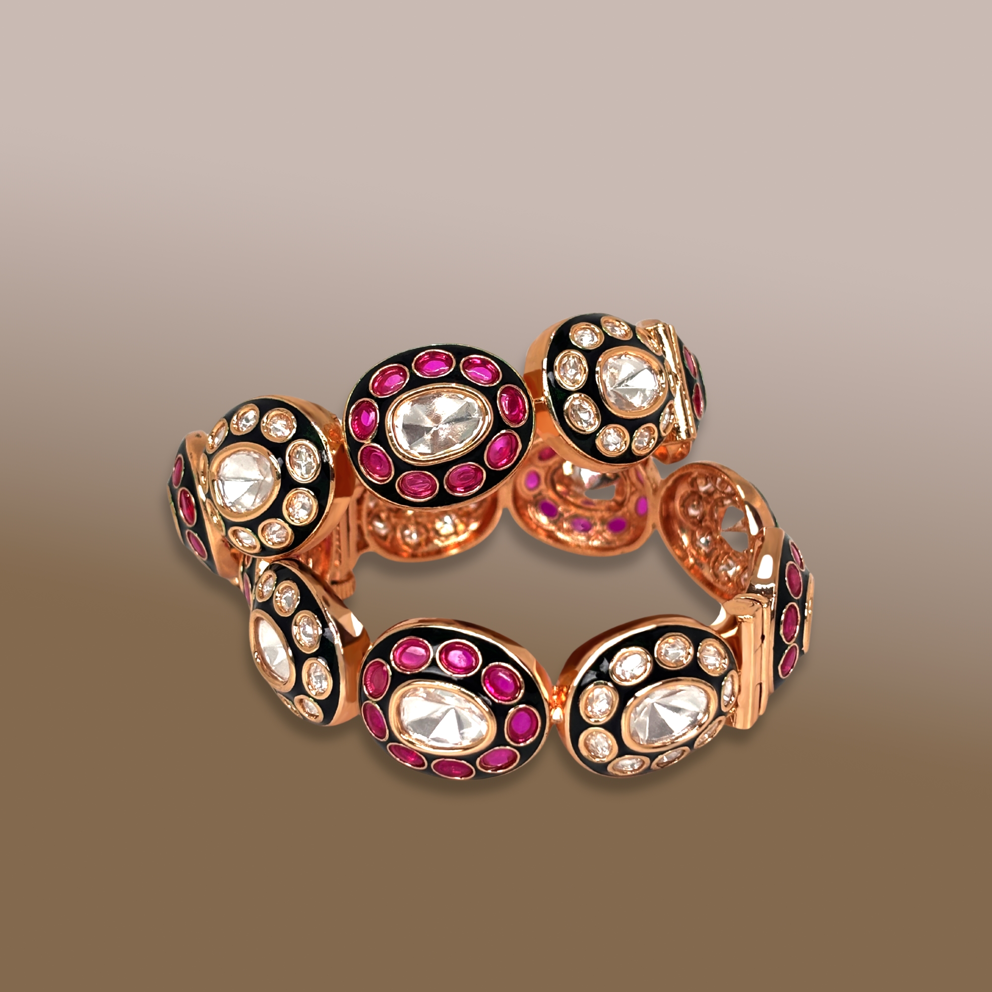 Elevate your traditional ensemble with our Royal RajRani Ruby Kundan Bangle. This handcrafted beauty features a luxurious arrangement of uncut polki-style stones, encircled with vibrant ruby-red and shimmering white kundan work. Set on a rose-gold polished base with intricate enamel detailing in green,this bangle is a true masterpiece of timeless Indian craftsmanship. Its bold yet elegant design makes it perfect for weddings, festive occasions, or statement styling. A treasure for any jewelry lover’s collection.