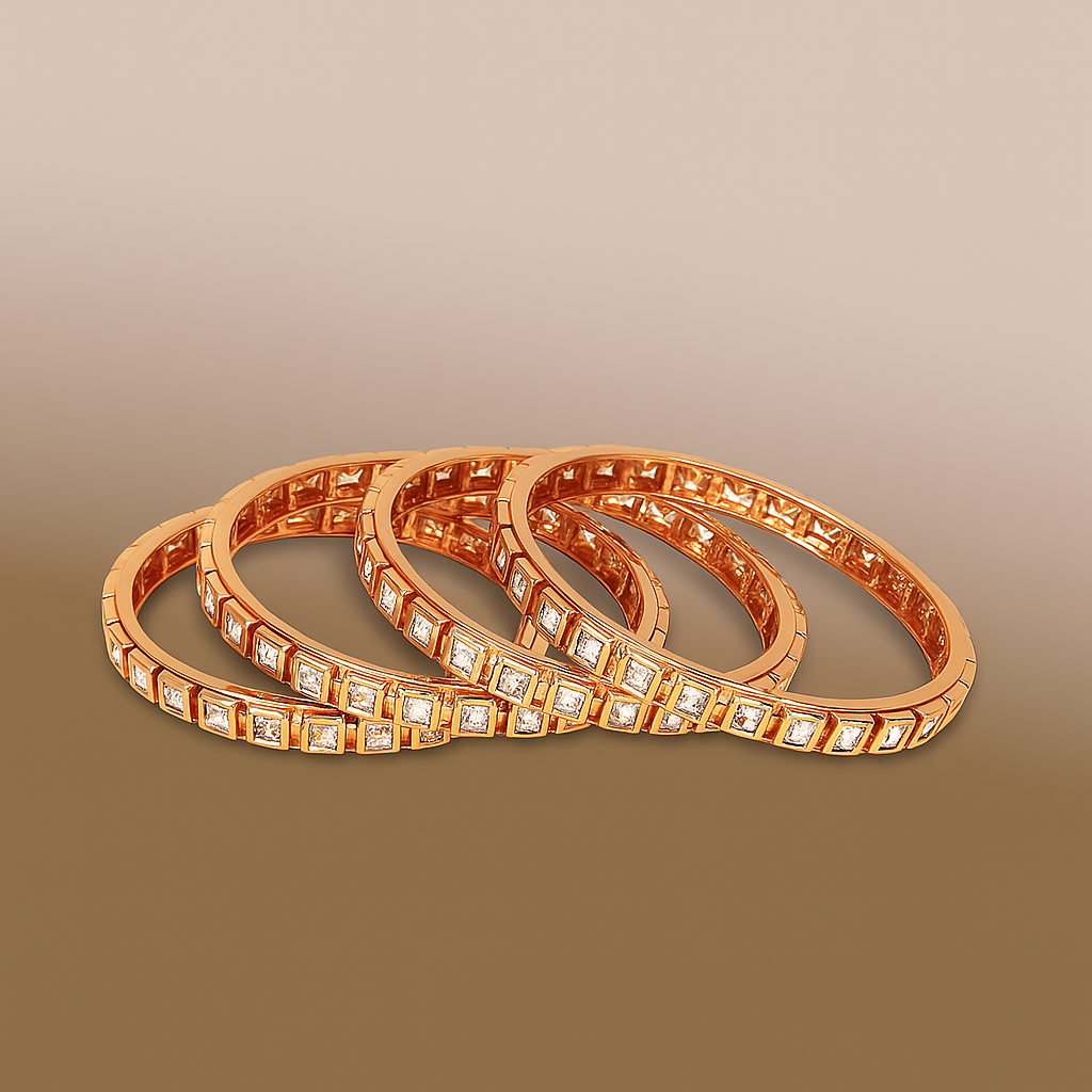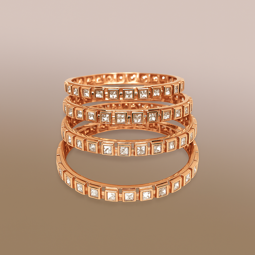 Minimalist luxury meets timeless charm in our Rajsi Classic Solitaire Square-Cut Bangles. These elegant bangles are crafted with precision and set in a warm rose gold tone, featuring a flawless row of square-cut cubic zirconia stones. The clean, geometric design adds a modern touch, making them perfect for both everyday elegance and special occasions.